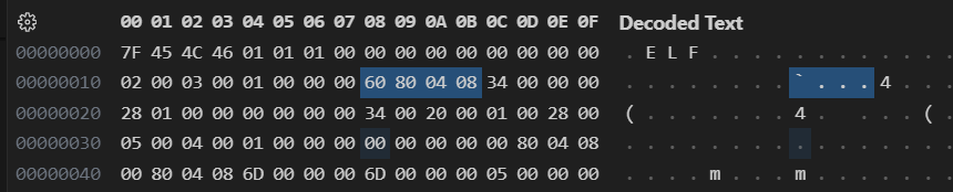 我用蓝色标出来的位置,根据计算不难发现是 e_entry,它已经位于0x8000000(128MB)以外(具体的数值为 0x8048060,读者不妨自行验证),但根据我们的默认设置,我们的内存大小只有128MB。另一方面来讲我们可以通过分页来调低这个位置,但它的具体位置也是不可控的。