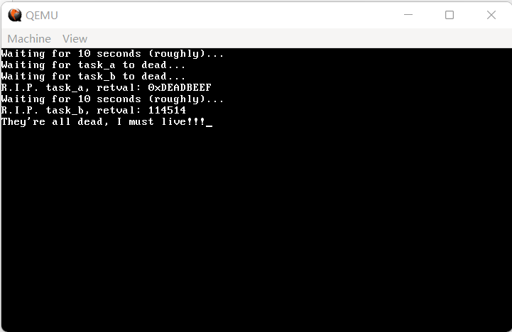 删去原本的 TASK 定义,替换为上面这一段。由于 exit 的返回值可以是任何一个东西,因此特意添加了一个 pid 变量,用来确认是否退出。当然这个变量可以换成随便一个东西,这里用 pid 只是一种用法。